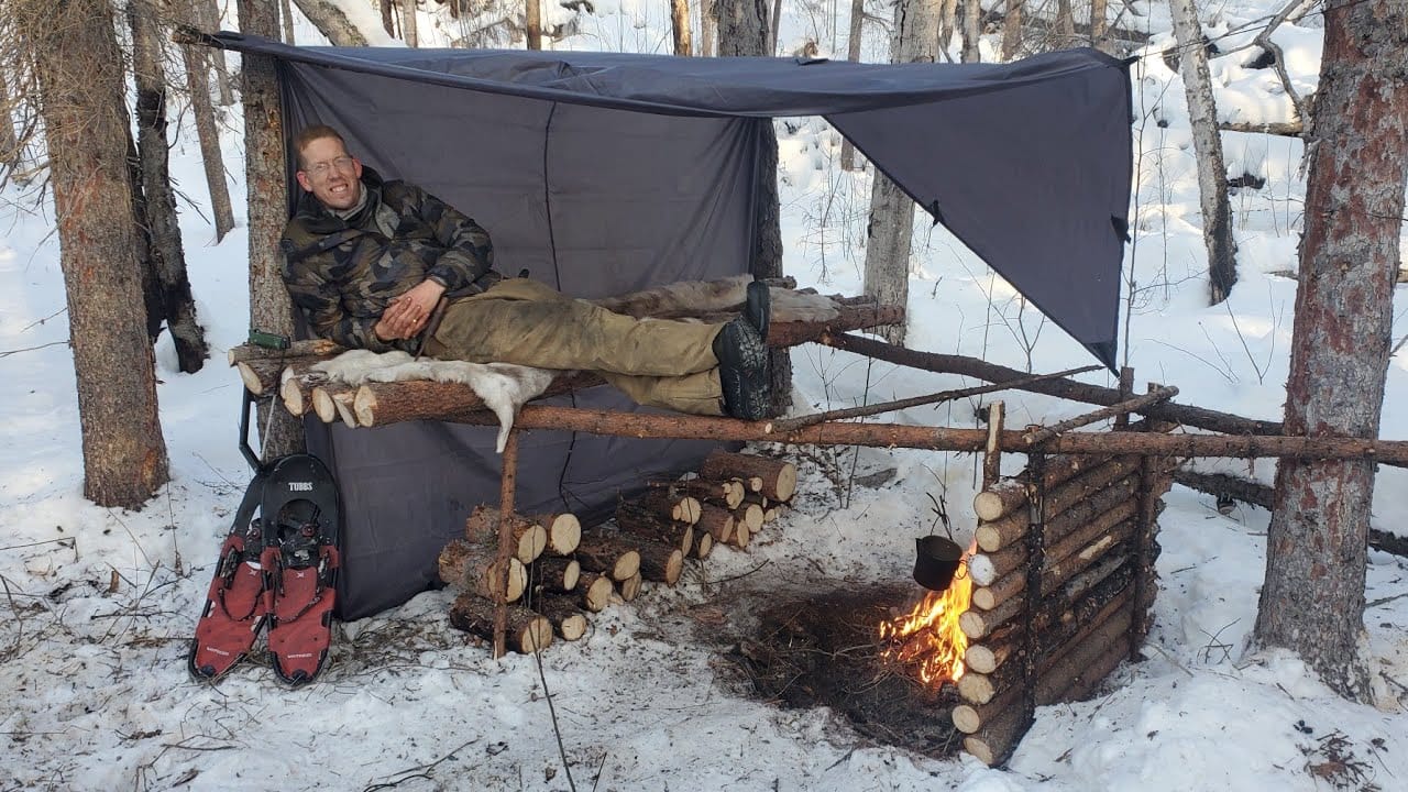 Winter Camping in Raised Bushcraft Shelter – Level 100 Campfire Cooking